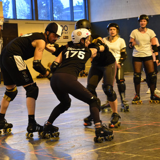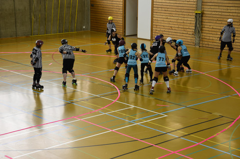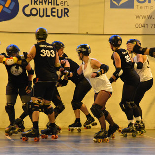 Le 2 décembre 2018, après une heure trente de route sous une pluie battante, nous arrivons à bon port avec une heure d'avance. Dans les vestiaires, le stress monte et le froid commence à nous ankyloser. L'échauffement intense et efficace des coaches nous permet de... nous échauffer, oui c'est le but. La présentation des équipes se fait sur des chants de Noël et le cri de guerre de nos adversaires, à base de "ça sent le sapin" colle bien au même thème. Le match démarre, les jams s'enchainent. Les Molly mènent, mais les Black Vocthkas suivent de près. Après 24 jams, nous nous inclinons 126 à 185, avec le sentiment du devoir accompli !... et l'envie d'en découdre deux semaines plus tard à Genève !